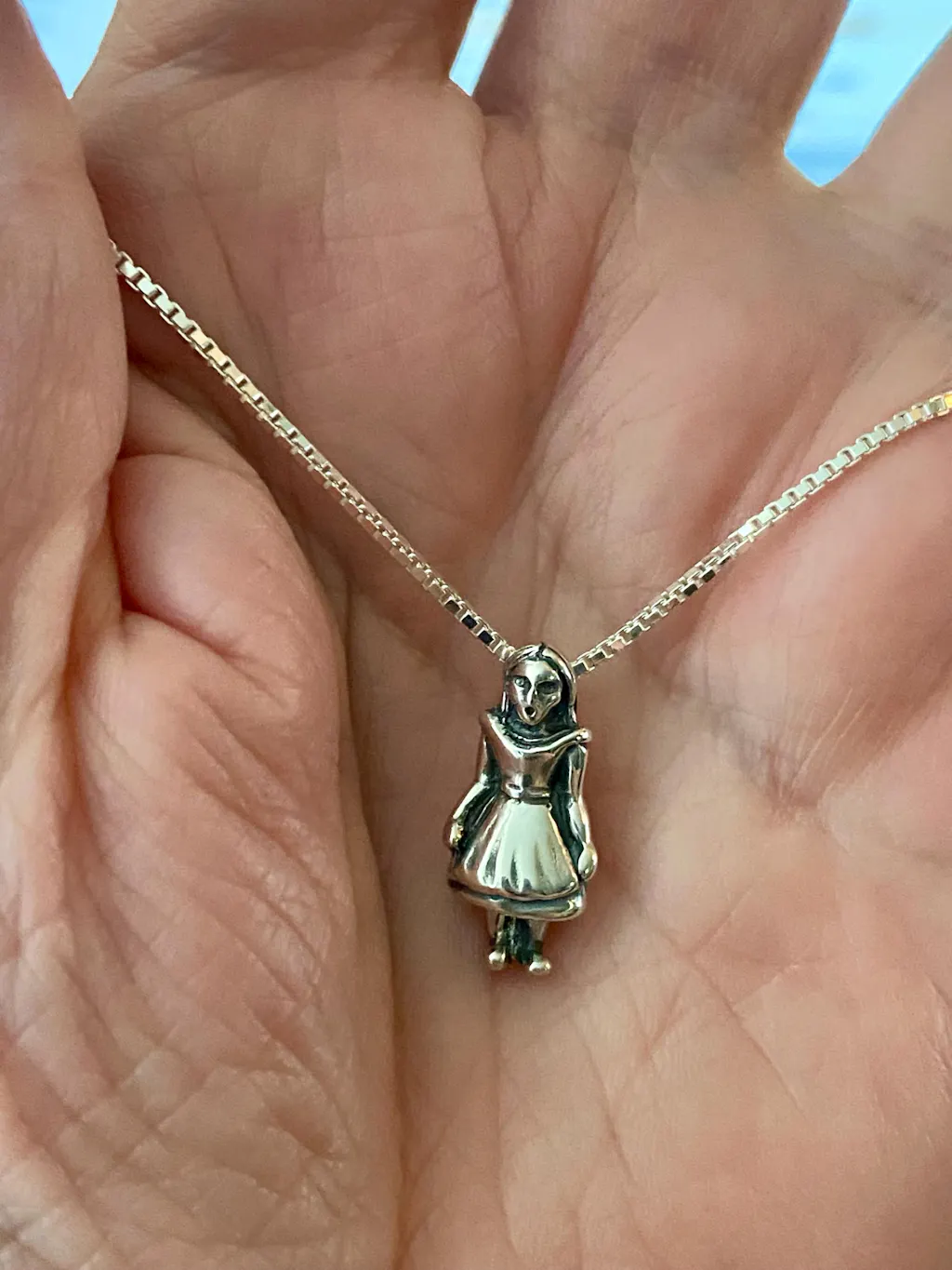 This solid sterling silver Alice Charm stands just 3/4" high. (Disclosure: Her size may change depending which side of the mushroom she eats:)
