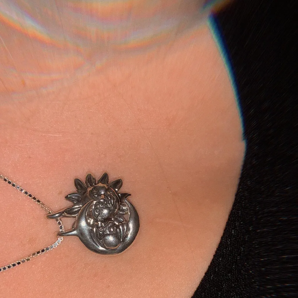 This unique two part Eclipse Pendant is cast in solid sterling silver. The Moon gently embraces its companion the Sun and they nestle together on the chain. Either charm can also be worn separately, so this design gives you three style variations. The combined pendant is 3/4" high. Indulge in a piece of our solar system.