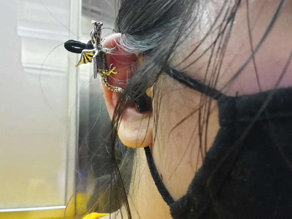 The dragon is absolutely beautiful! The details are intricate and it sparkles in the light. I've received so much love over this piece π When its placed on my ear in the intended way, it's only a slight pressure and I often forget it's there! Extremely weightless and super comfortable, a staple in my appearance ever since I received it. It takes a bit of getting used to because I thought it wouldn't stay in place when placed where demonstrated in the photos, but its a lot more secure than expected.