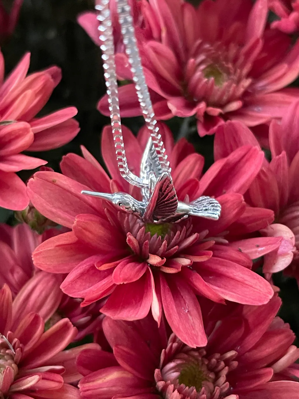 This three dimensional hummingbird charm delicately detailed. It is cast in sterling silver and is 1/2" high and 3/4" long.
