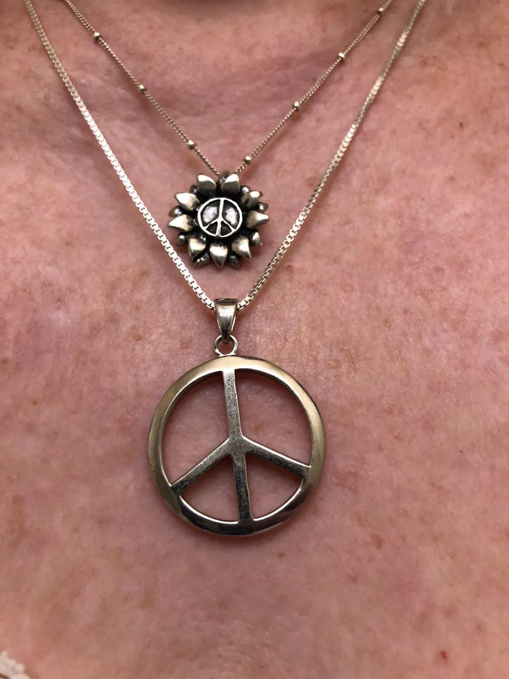 Take a trip back into the 60's wearing this whimsical version of the Flower Power Peace Symbol. The charm is cast in sterling silver and is 3/4" high. Wear it with pride and a vision of Peace for our planet.
