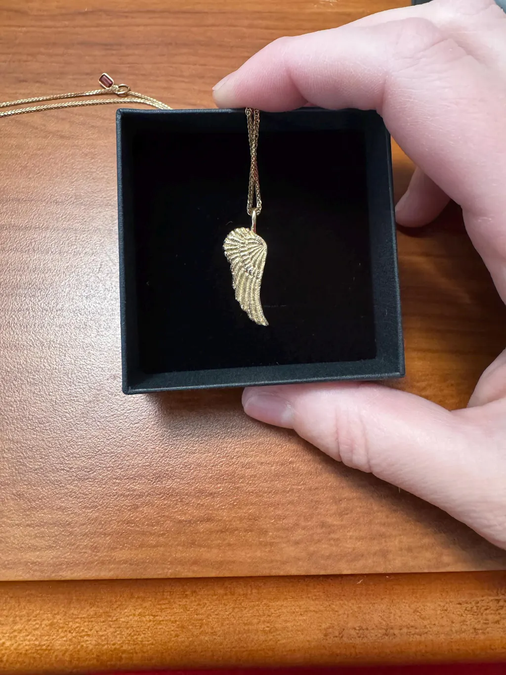 This detailed Guardian Angel Wing pendant is lost wax cast in 14K gold. The wing is carefully detailed both front and back. It is 1-1/8" high and 7/16" wide.