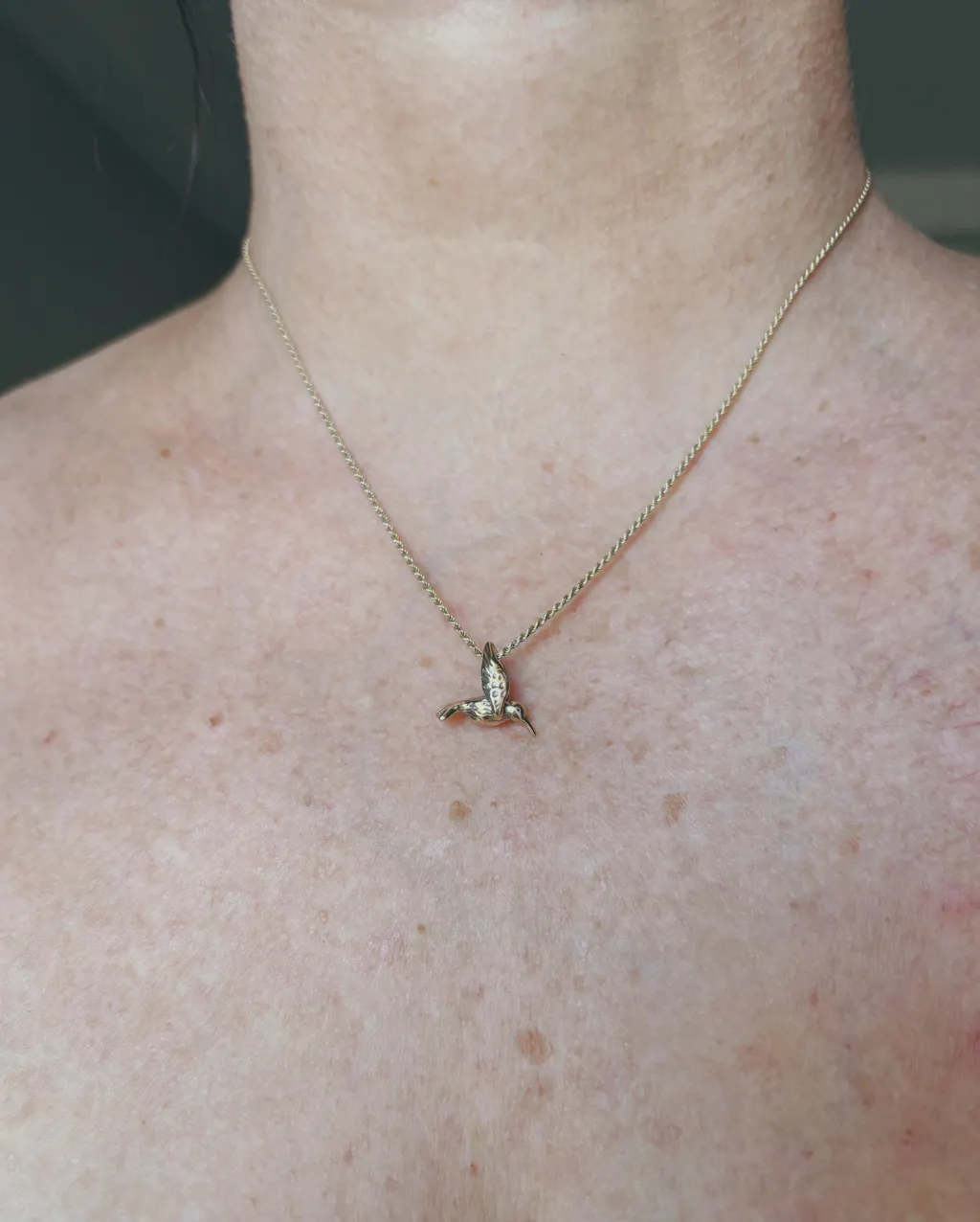 This delicate solid 14k gold Hummingbird Charm is 5/8" long and completely three dimensional. A chain slips through the opening between the hummingbirds wings. Fly away with one today!