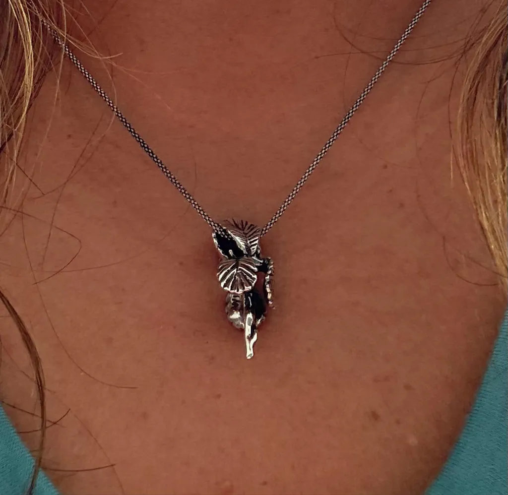 Our Iris Pendant is in full bloom. This beautiful Iris flaunts curvaceous frilled petals and the stem is detailed with unfolding leaves. It is cast in sterling silver and is 1 3/8" long and 1/2" across. A chain slips through side openings between the petals. Bringing this design to fruition was fraught with technical challenges but I am thrilled with how it turned out. Creating an intricate design with an open center is difficult so the piece was cast in two parts and the halves soldered together.