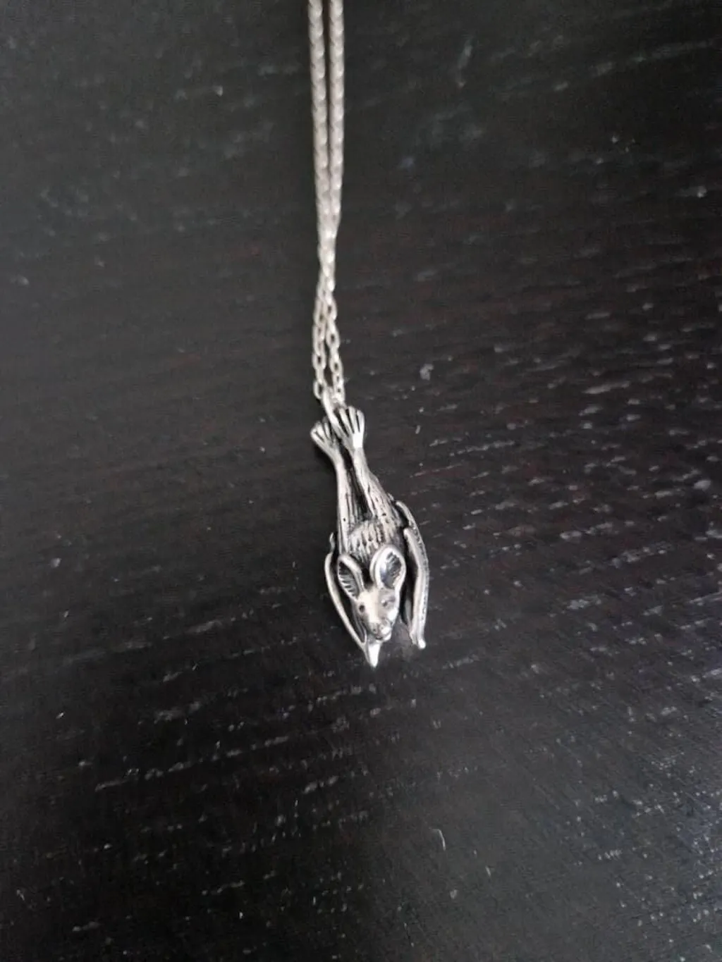 This whimsical bat pendant is completely solid and three dimensional. It is 1-1/4" long and hangs upside down between folded wings.