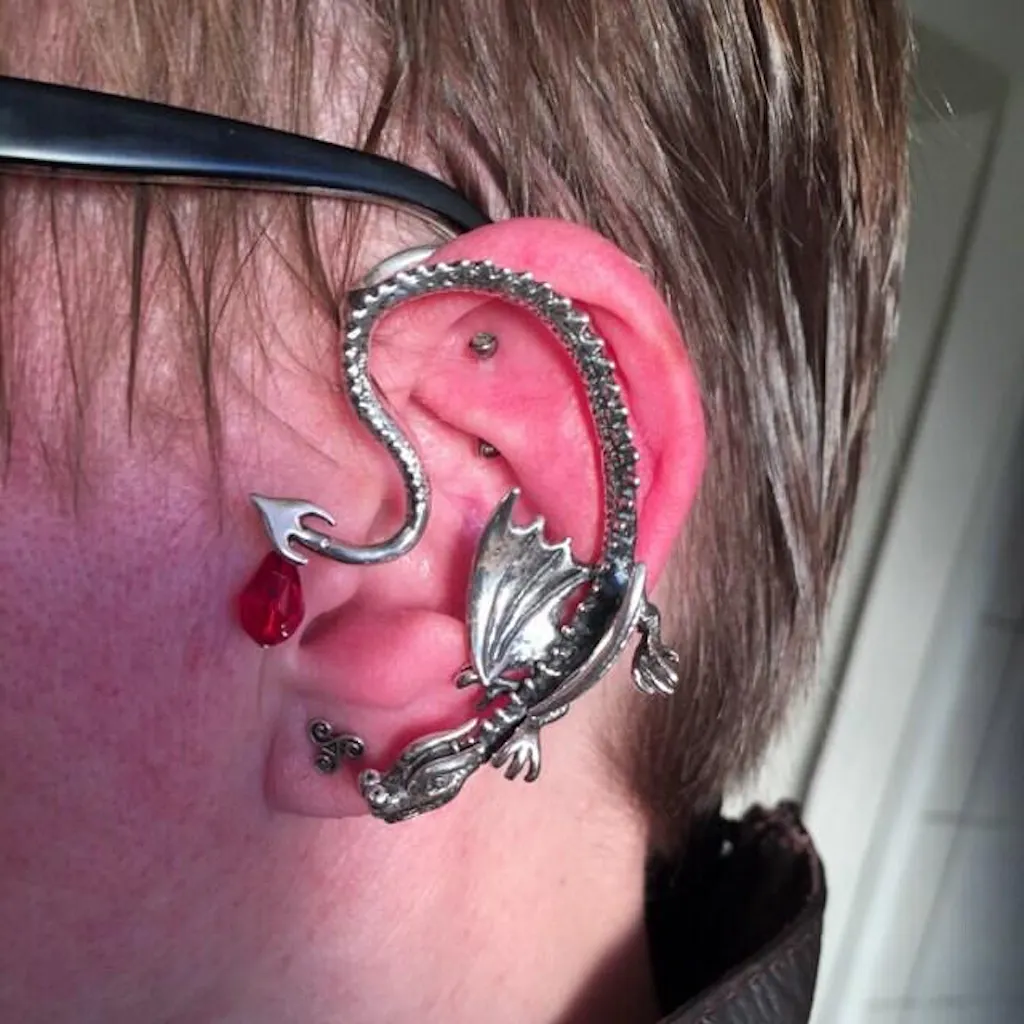 Take your place in the spotlight wearing this dramatic, sterling silver Throne Dragon Ear Wrap. This graceful and powerful dragon is completely three dimensional and beautifully detailed. The dragon curves gracefully down and along the left ear only.