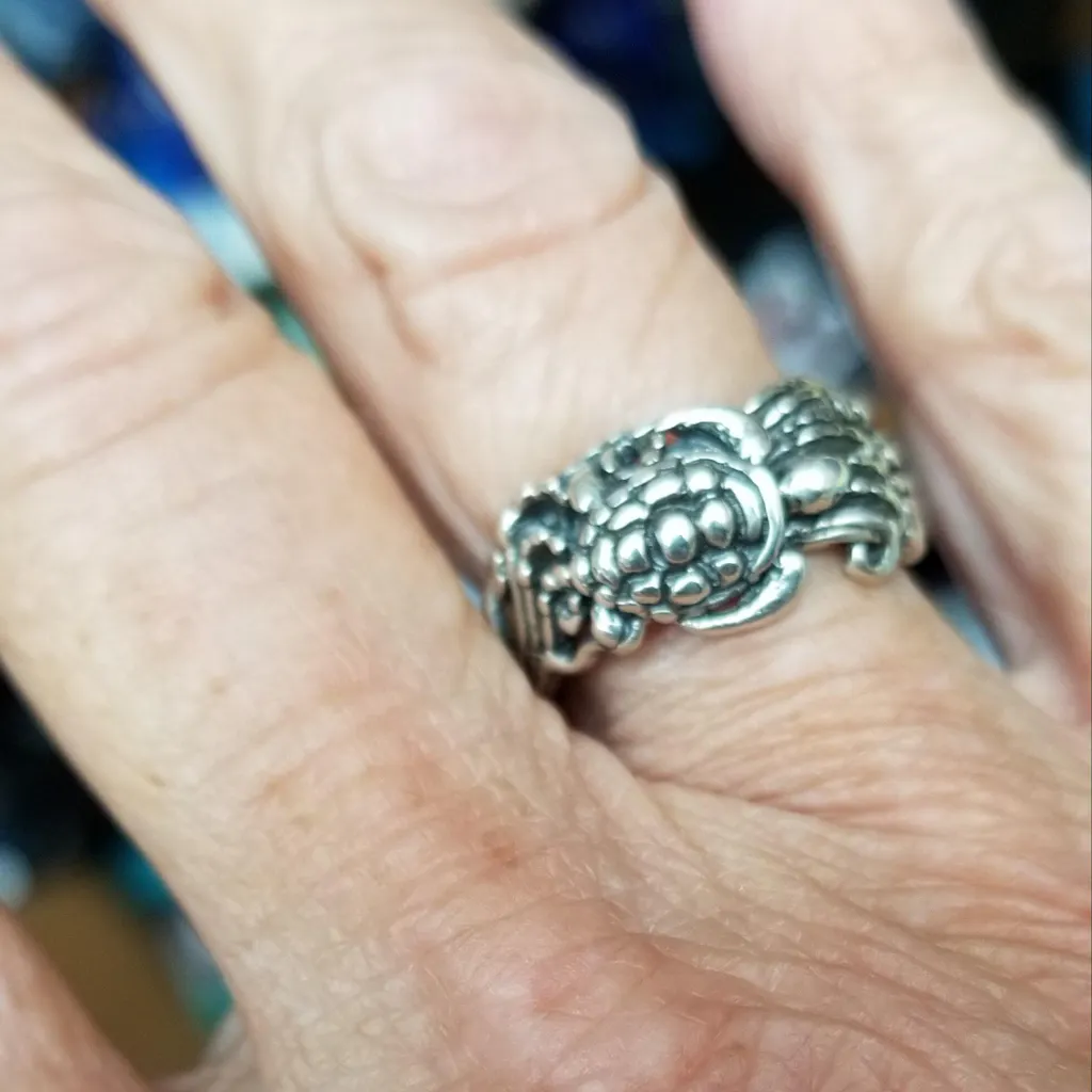 The sterling silver Wave Rider Sea Turtle Ring features a detailed sea turtle riding frothy waves that curve and crest along the curvature of the band